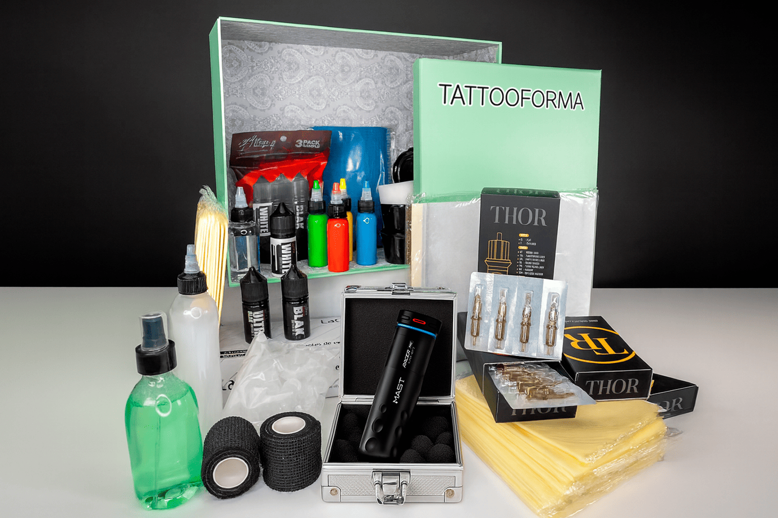 El kit de iniciación al tatuaje de Tattooforma contiene todo el material esencial para que puedas empezar a trabajar y dar rienda suelta a tu arte desde el primer momento. Se compone de lo siguiente: